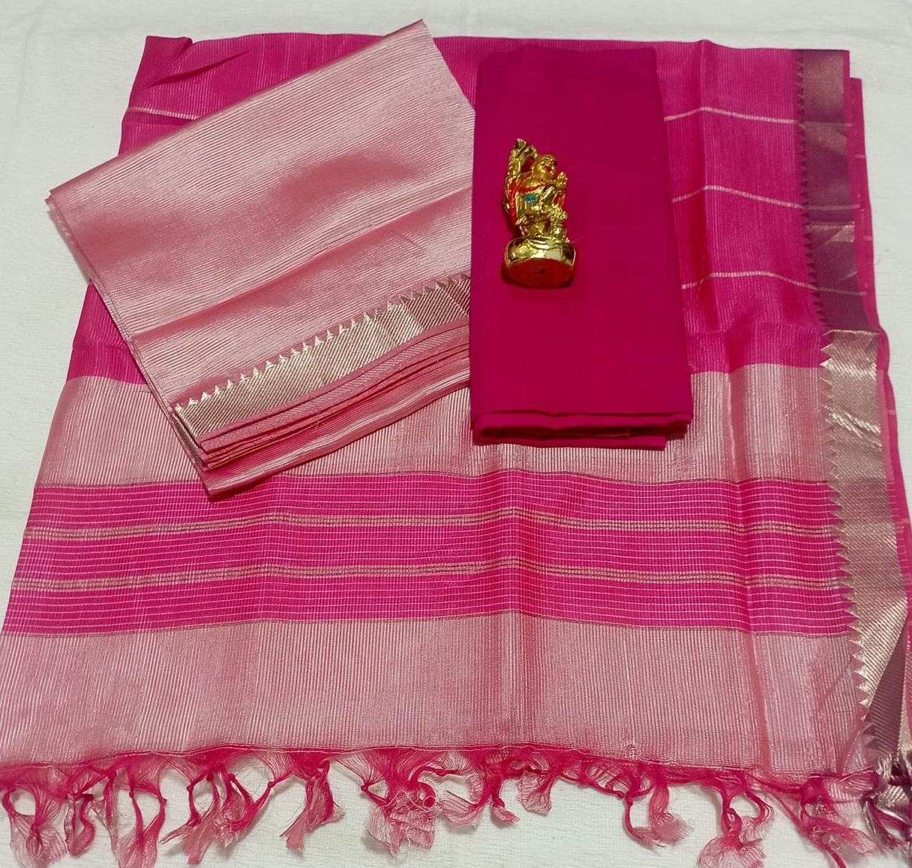 Pure handwoven Mangalagiri Pattu saree in a vibrant bright pink shade with elegant silver-toned borders for a graceful festive look.