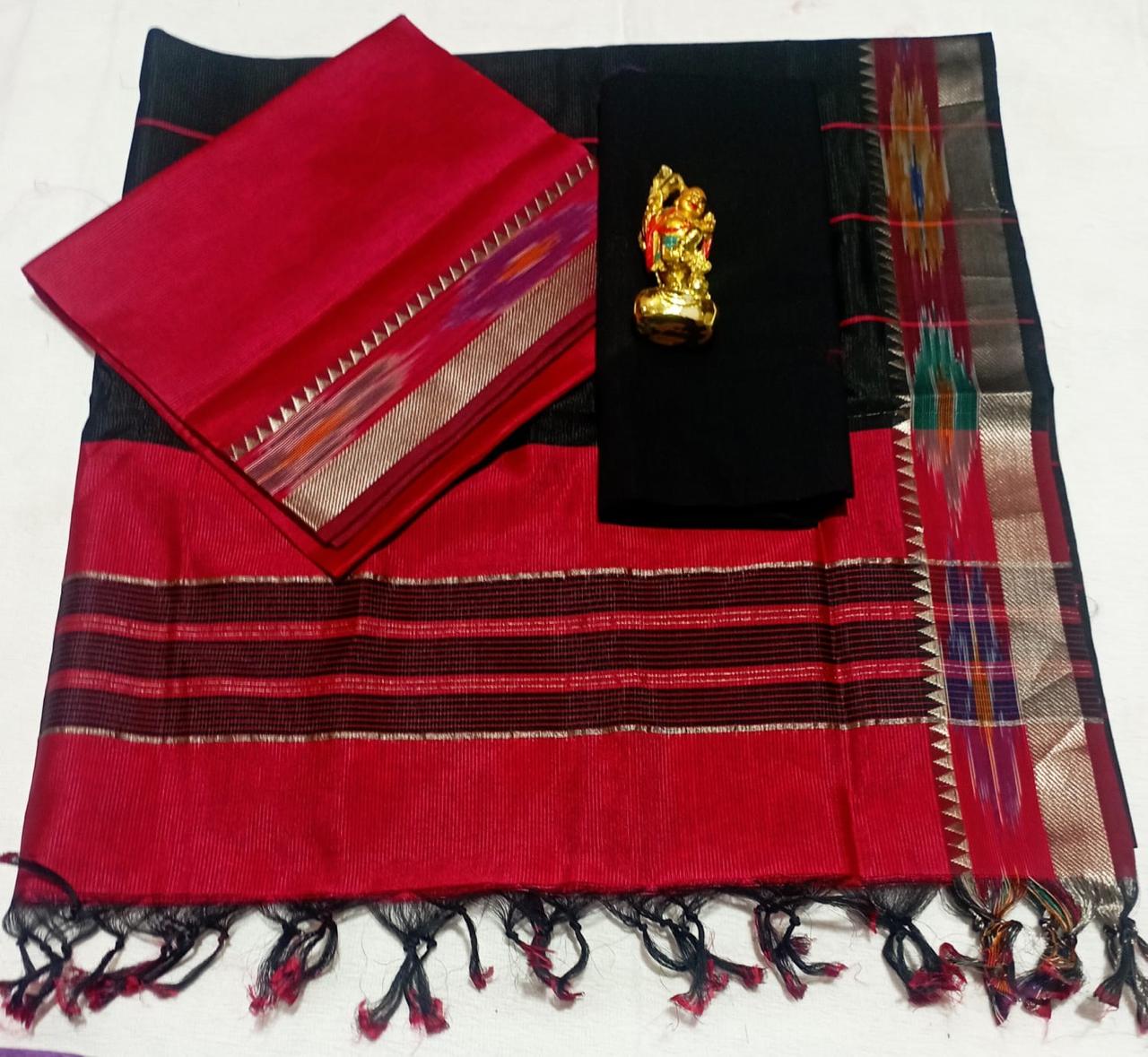 Pure handwoven Mangalagiri Pattu saree in a rich classic red shade with a bold black contrast border and elegant zari detailing.