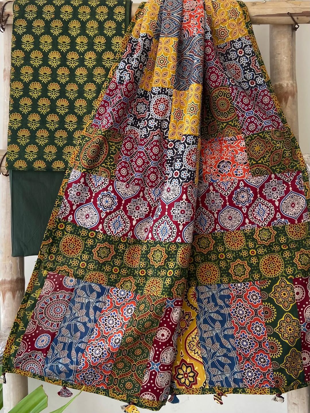 A vibrant forest green pure cotton saree featuring rich patchwork-style traditional prints, paired with a coordinated printed blouse for an elegant ethnic appeal.
