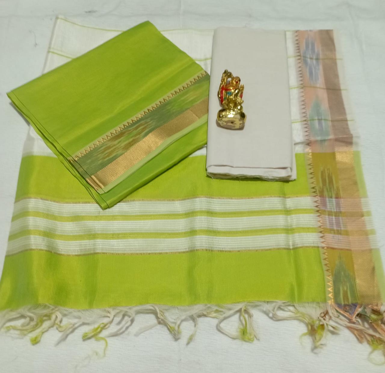 Pure handwoven Mangalagiri Pattu saree in a fresh green shade with soft pastel zari borders, offering a lively yet elegant look.