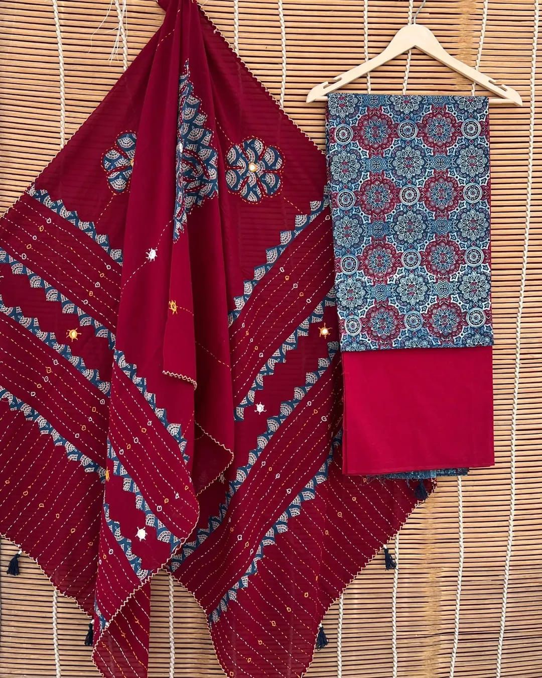 Elegant maroon cotton saree with classic Ajrakh-inspired motifs, paired with a richly patterned indigo blue blouse.