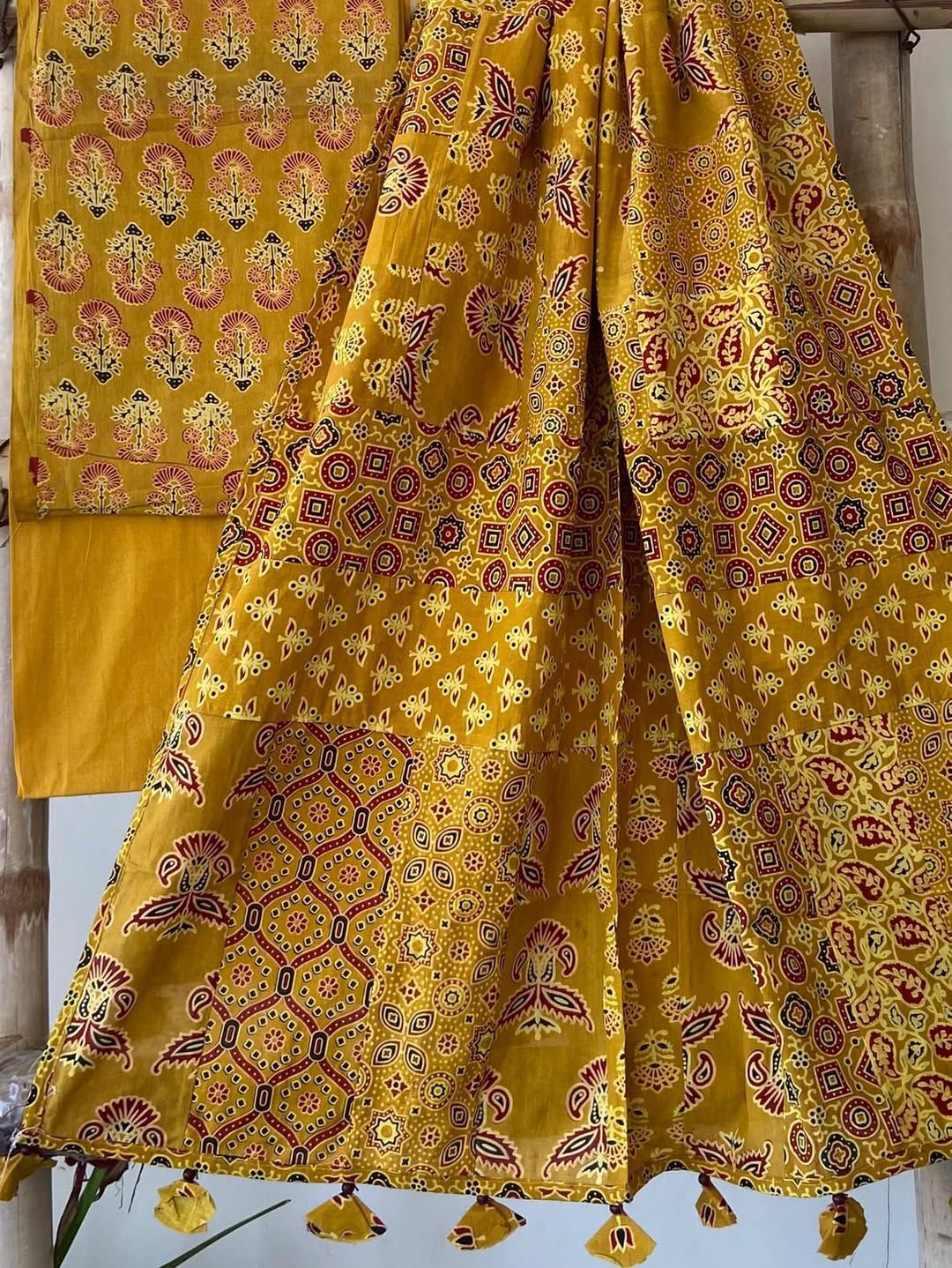 A vibrant mustard yellow pure cotton saree featuring classic Ajrakh-style patchwork prints with floral and geometric motifs, paired with a matching printed blouse.