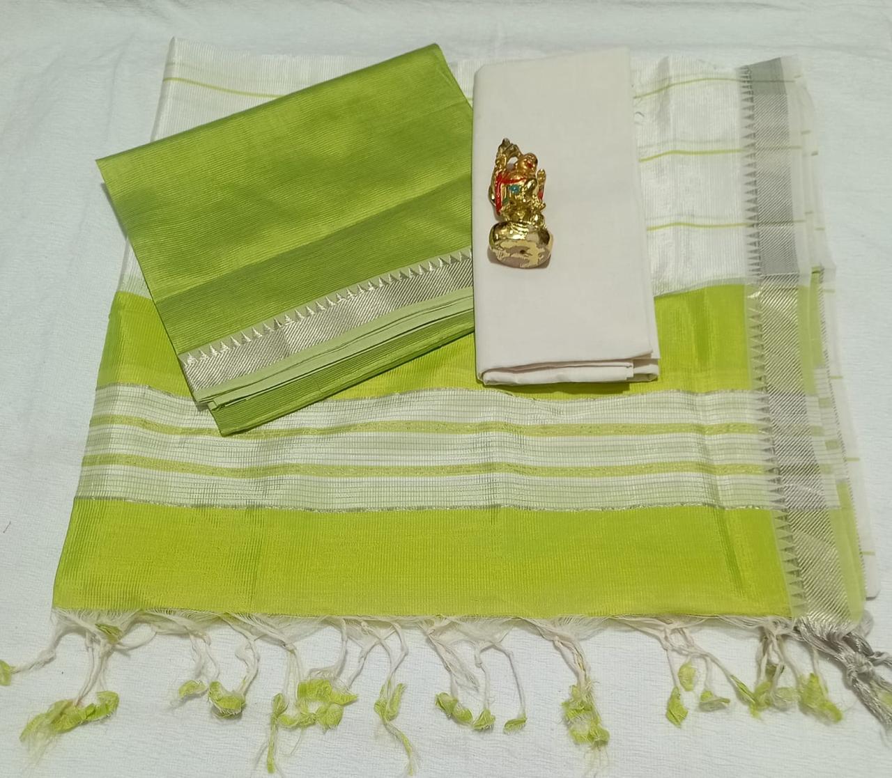 Pure handwoven Mangalagiri Pattu saree in refreshing pista green with subtle white stripes and elegant silver-toned borders.