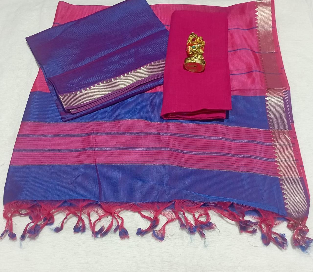 Pure handwoven Mangalagiri Pattu saree featuring a rich royal blue body with vibrant magenta pink contrast and elegant silver-toned borders.