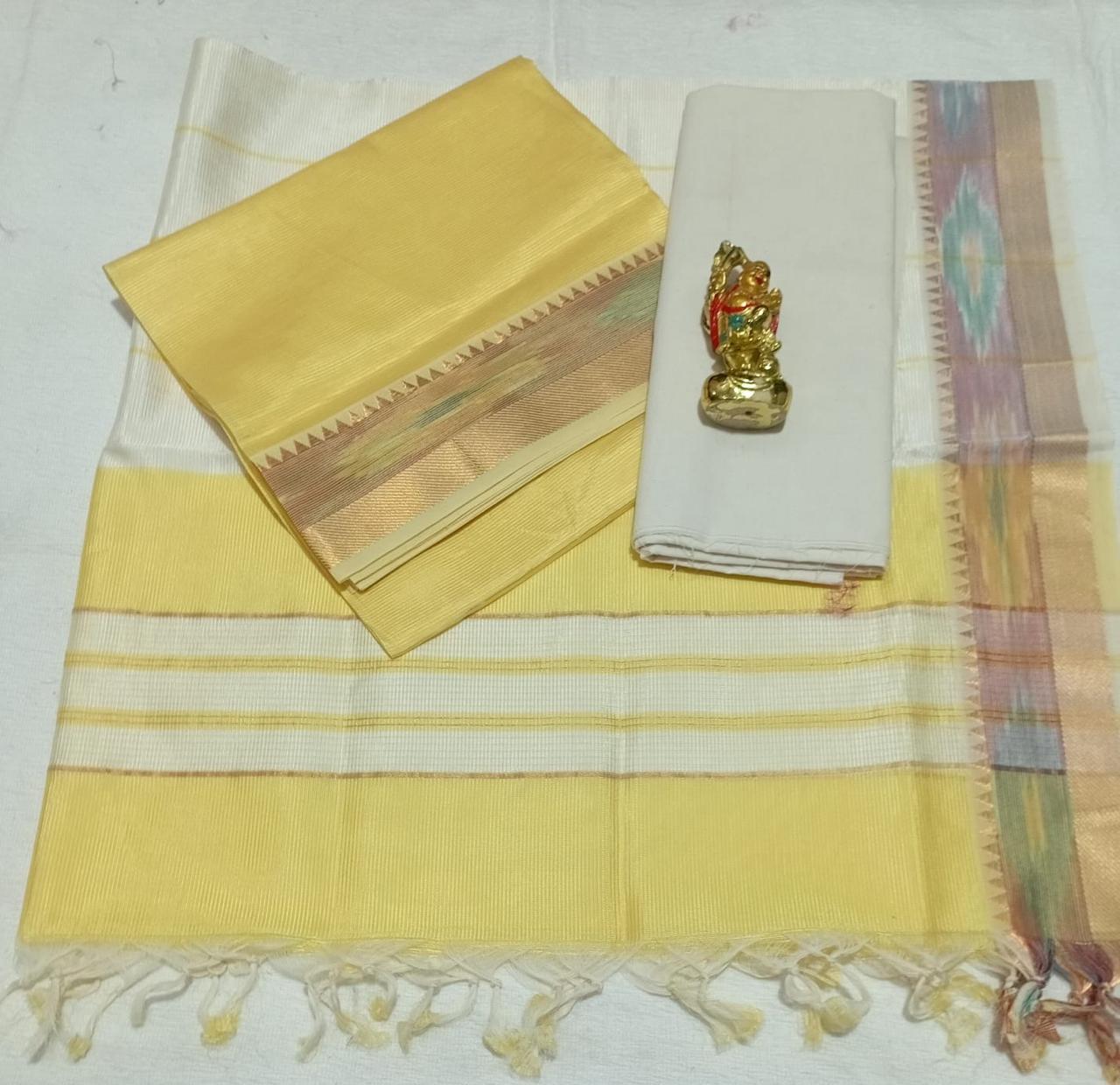 Pure handwoven Mangalagiri Pattu saree in a soft yellow shade with subtle pastel zari borders, offering a fresh and graceful look.